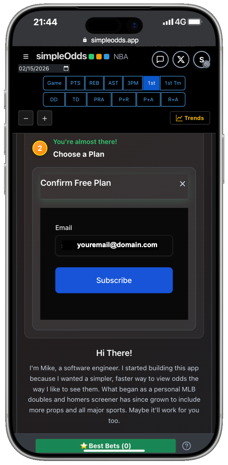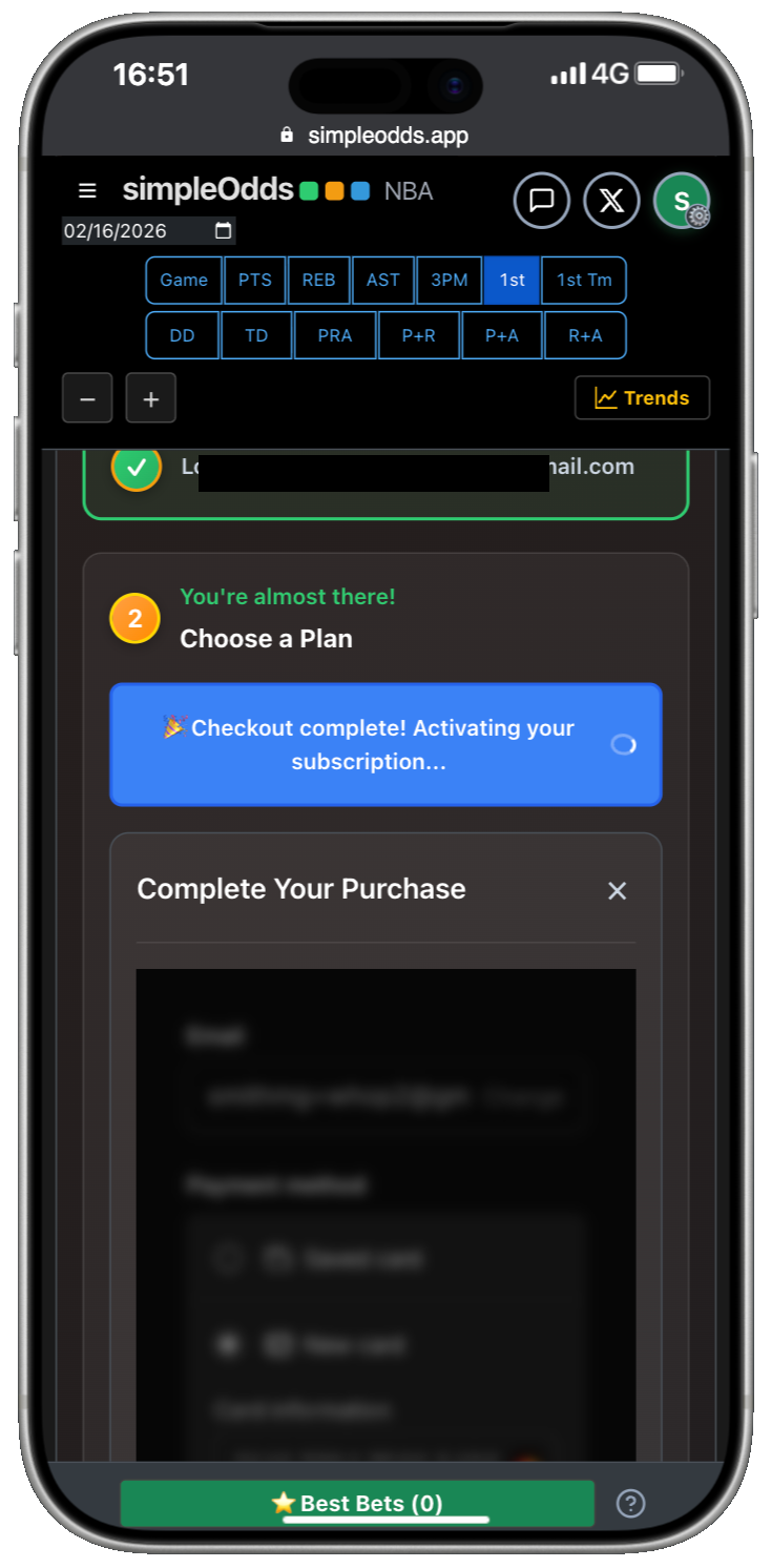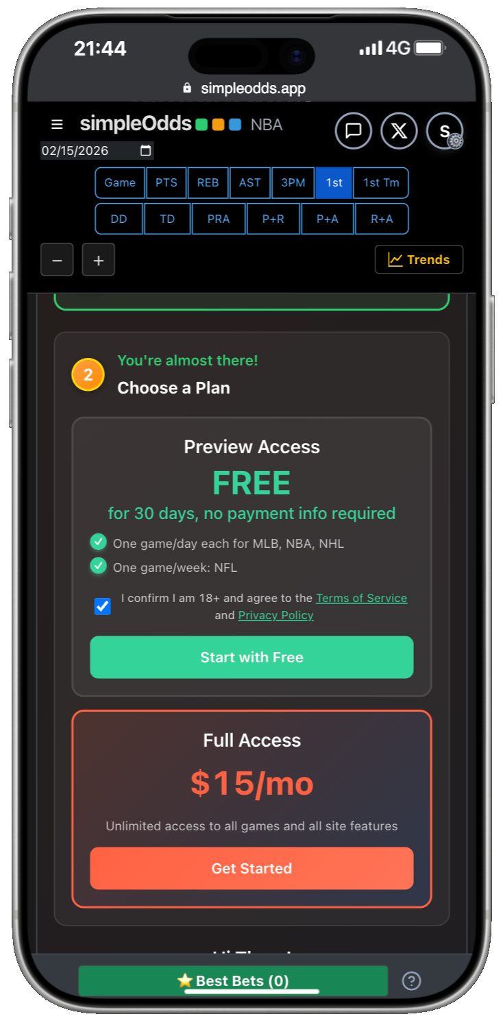 If you are creating a new account, once you have created your Whop account and authorized SimpleOdds to access that account, you are redirected back to the main SimpleOdds screen. To gain access to the odds screen, you need to select one of the available plans:
