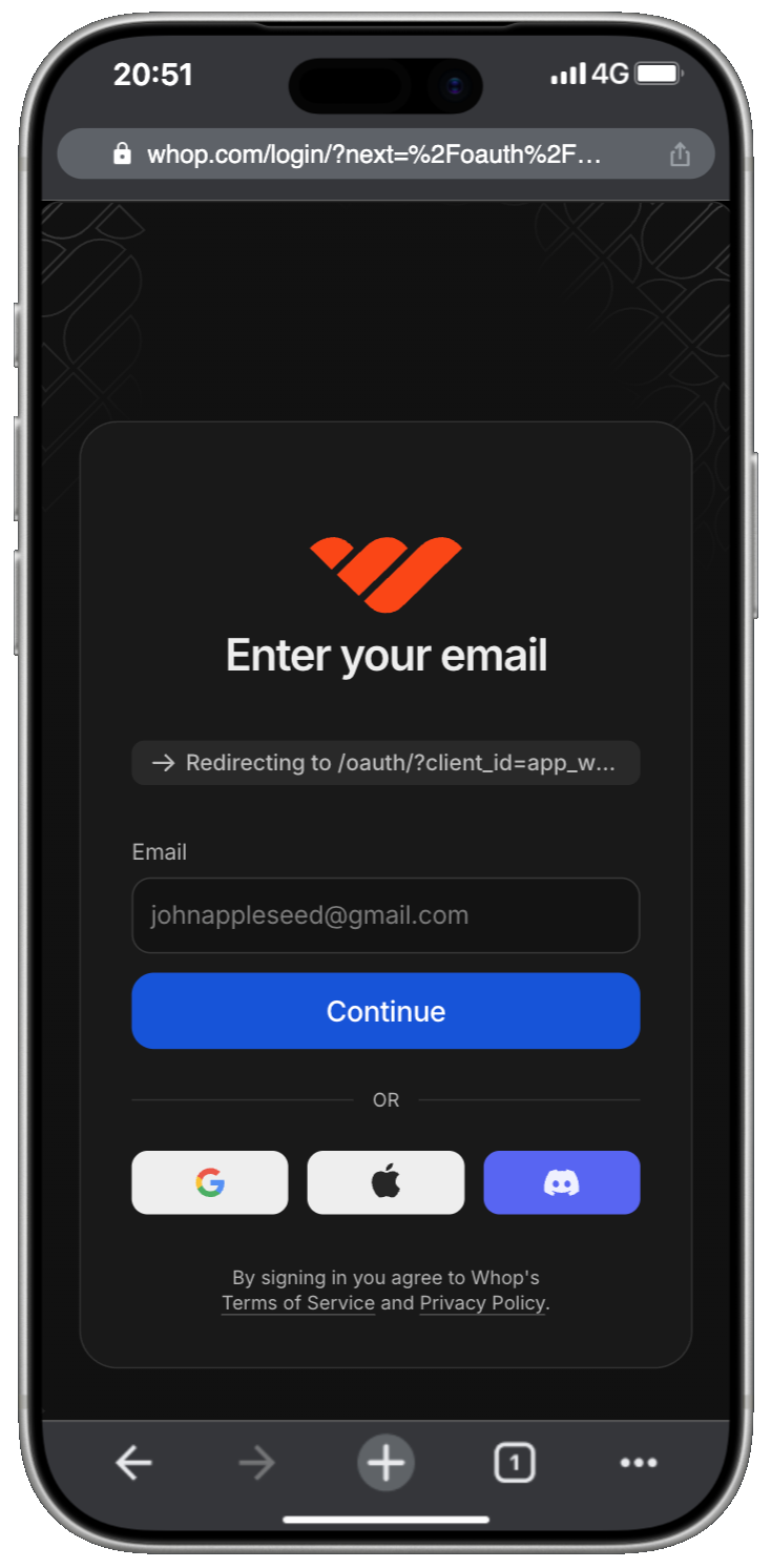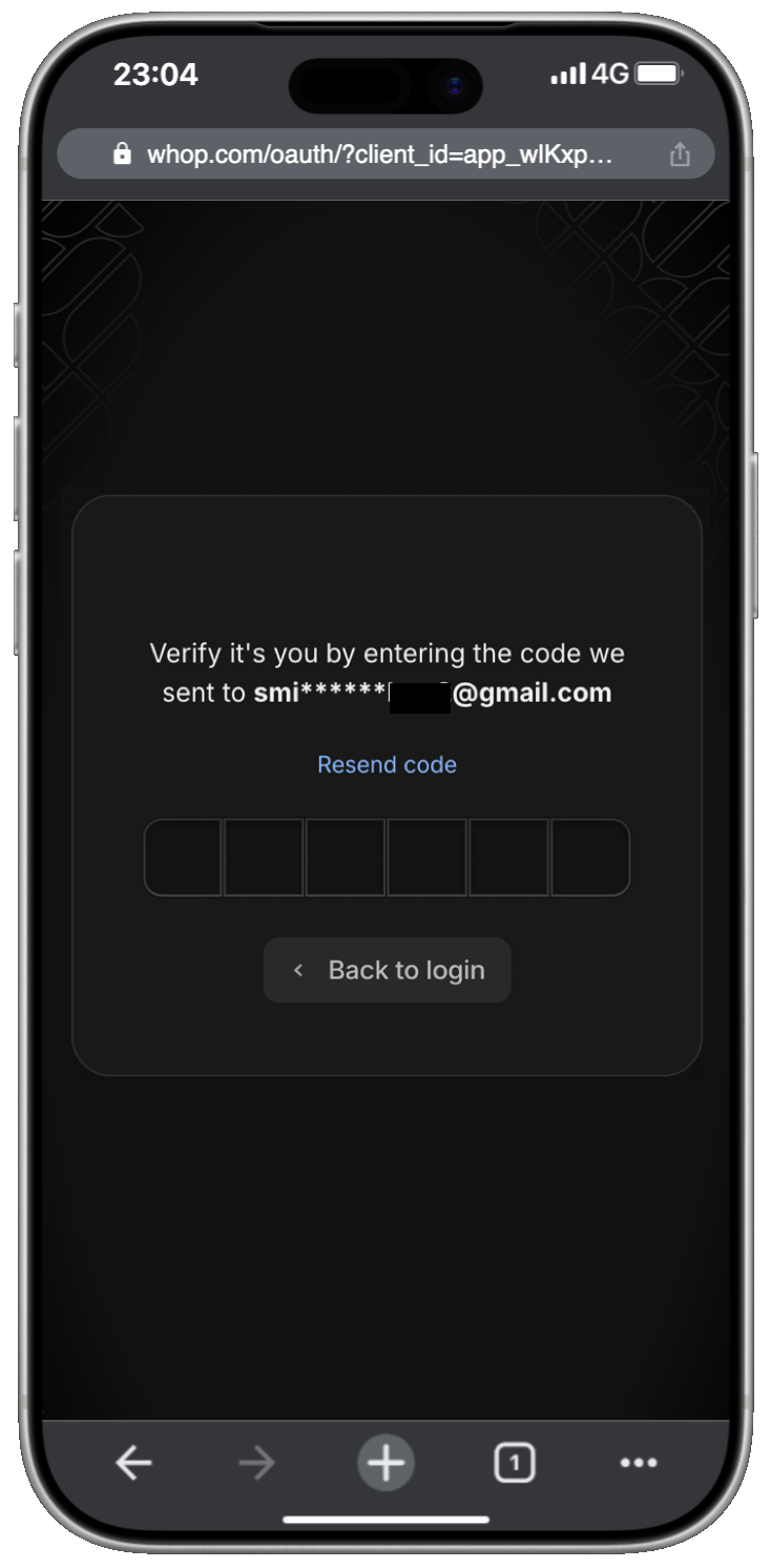 Whop will send you a verification code. Enter that code in the screen below.
