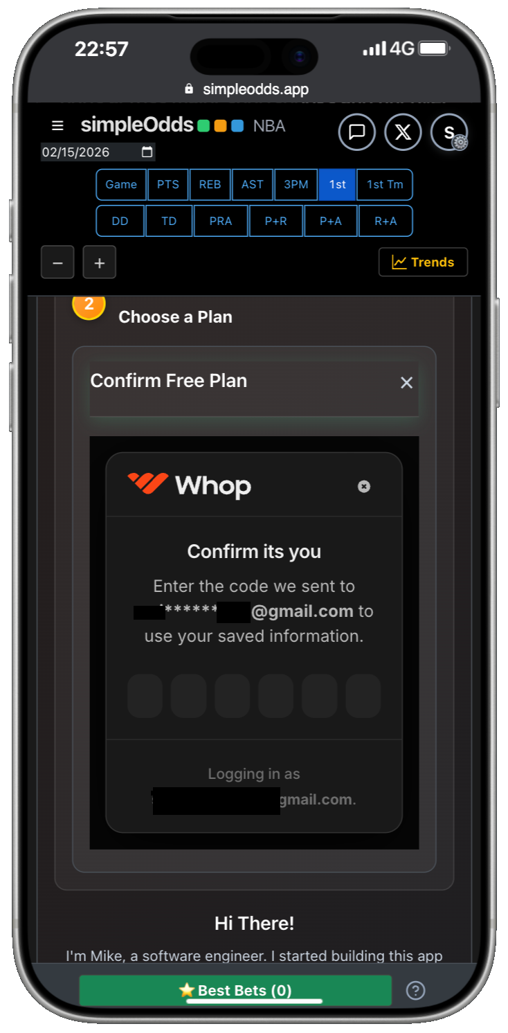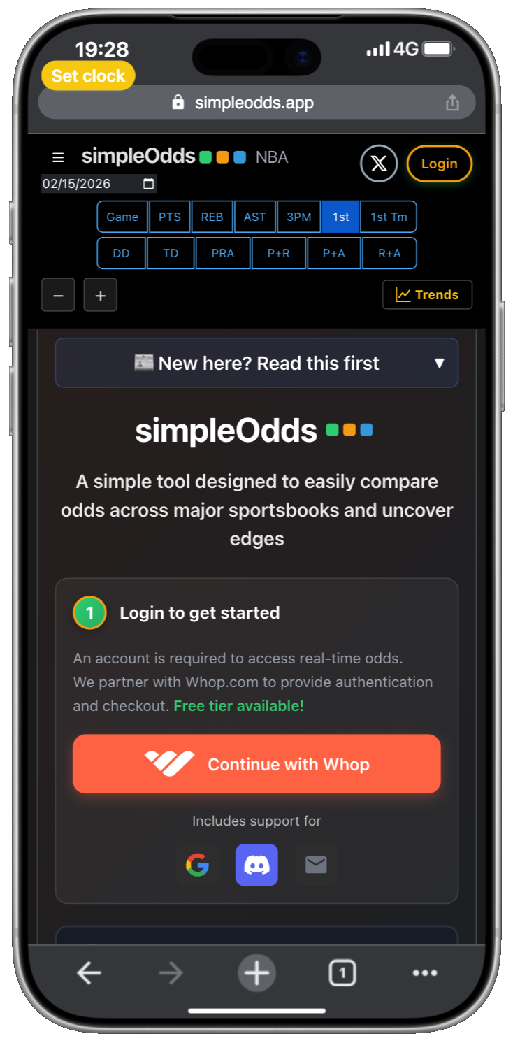 SimpleOdds uses Whop for authentication and payment processing. Whether you are creating a new account or logging into an existing account, you do so by clicking the Continue with Whop button from the main screen: