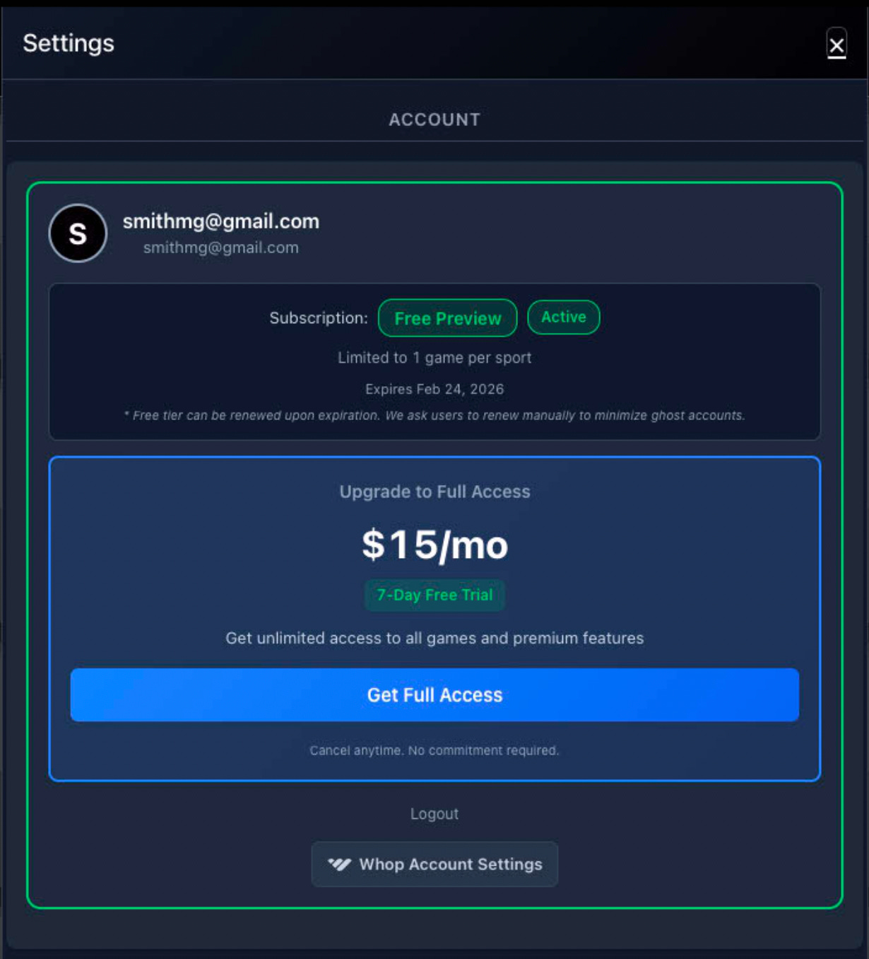 The Free Preview/Limited Access plan provides odds for one game per sport/day (one game per week for NFL/NCAAF). This plan expires after 30 days but users are free to re-subscribe every 30 days. We do this to make account cleanup easier.
