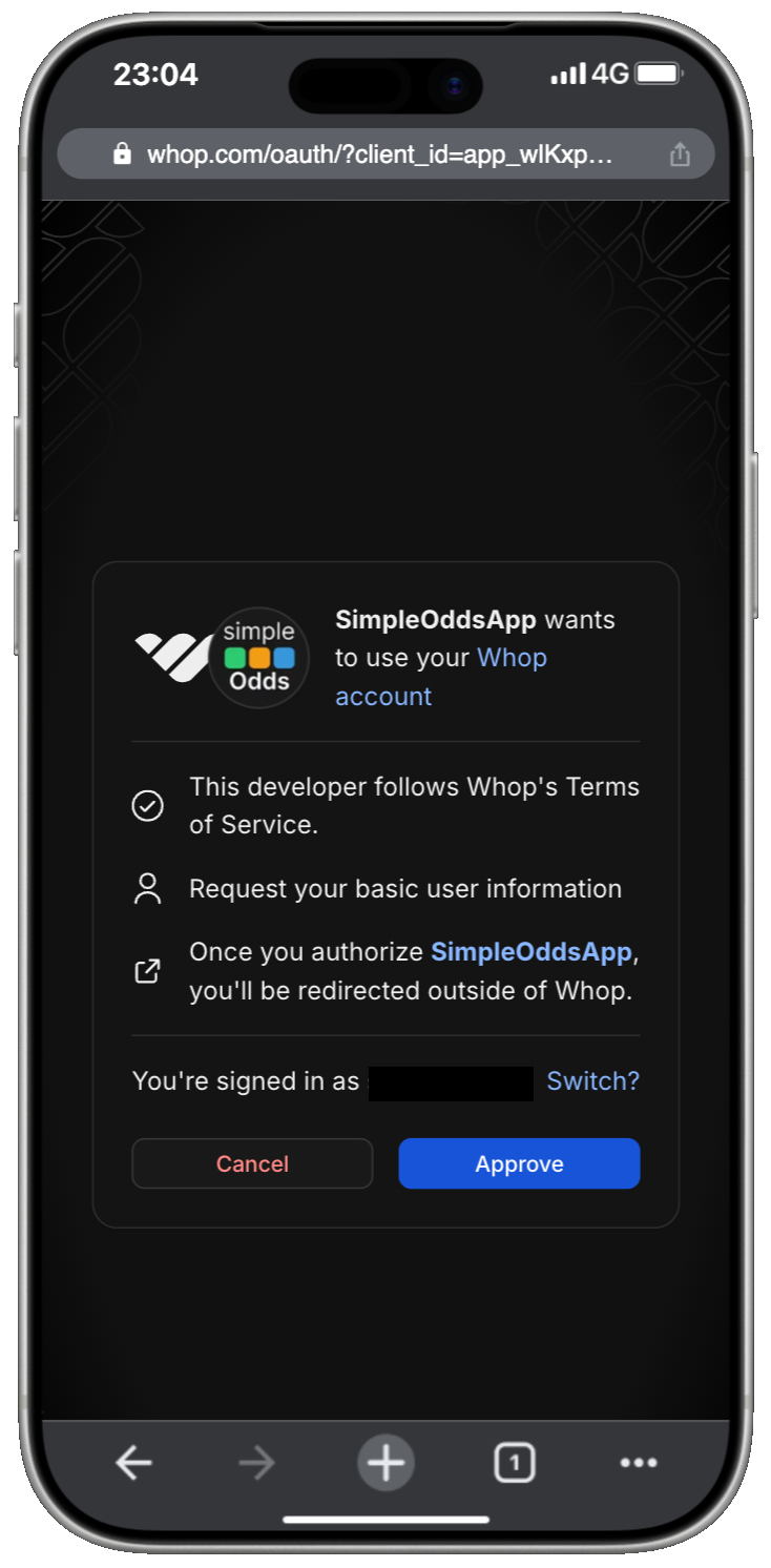 Any time you are logging in, Whop will prompt you to authorize SimpleOdds to access your Whop account. Click the Approve button.